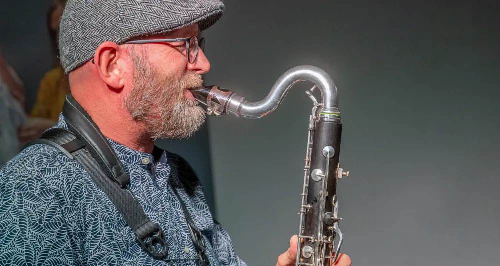 rhythmisch, melodisch schöpft er das große Potential seiner Bassklarinette aus